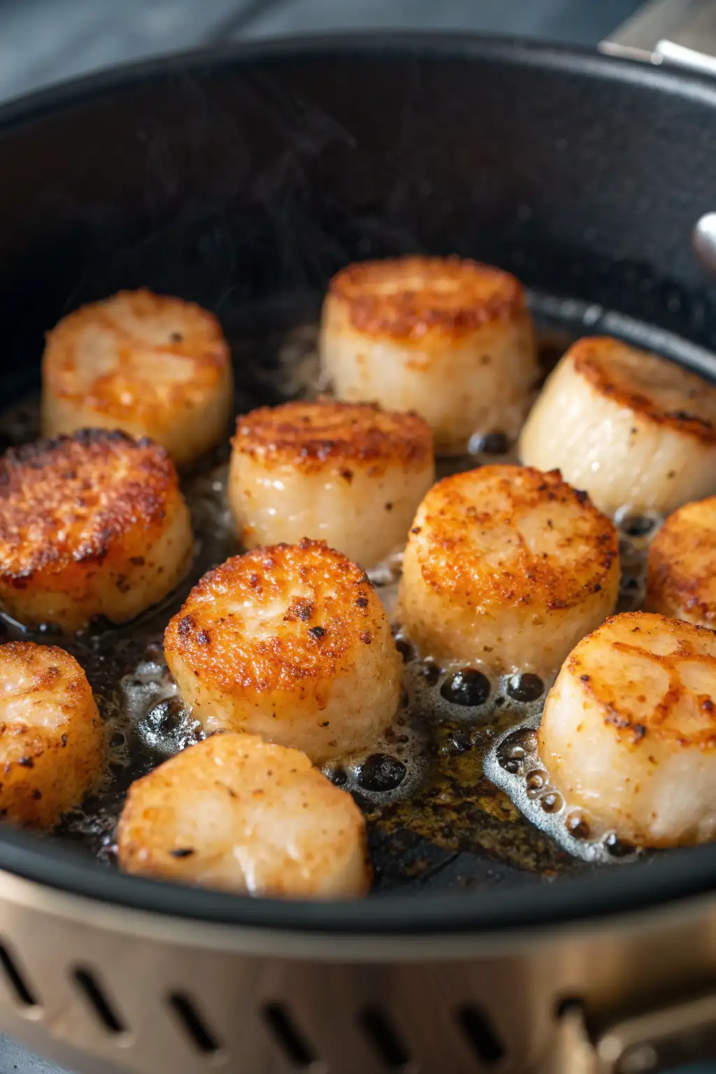 Seconda Fase di Cottura: Continua a cuocere per altri 4 minuti. Le capesante dovrebbero apparire dorate e leggermente croccanti all’esterno.