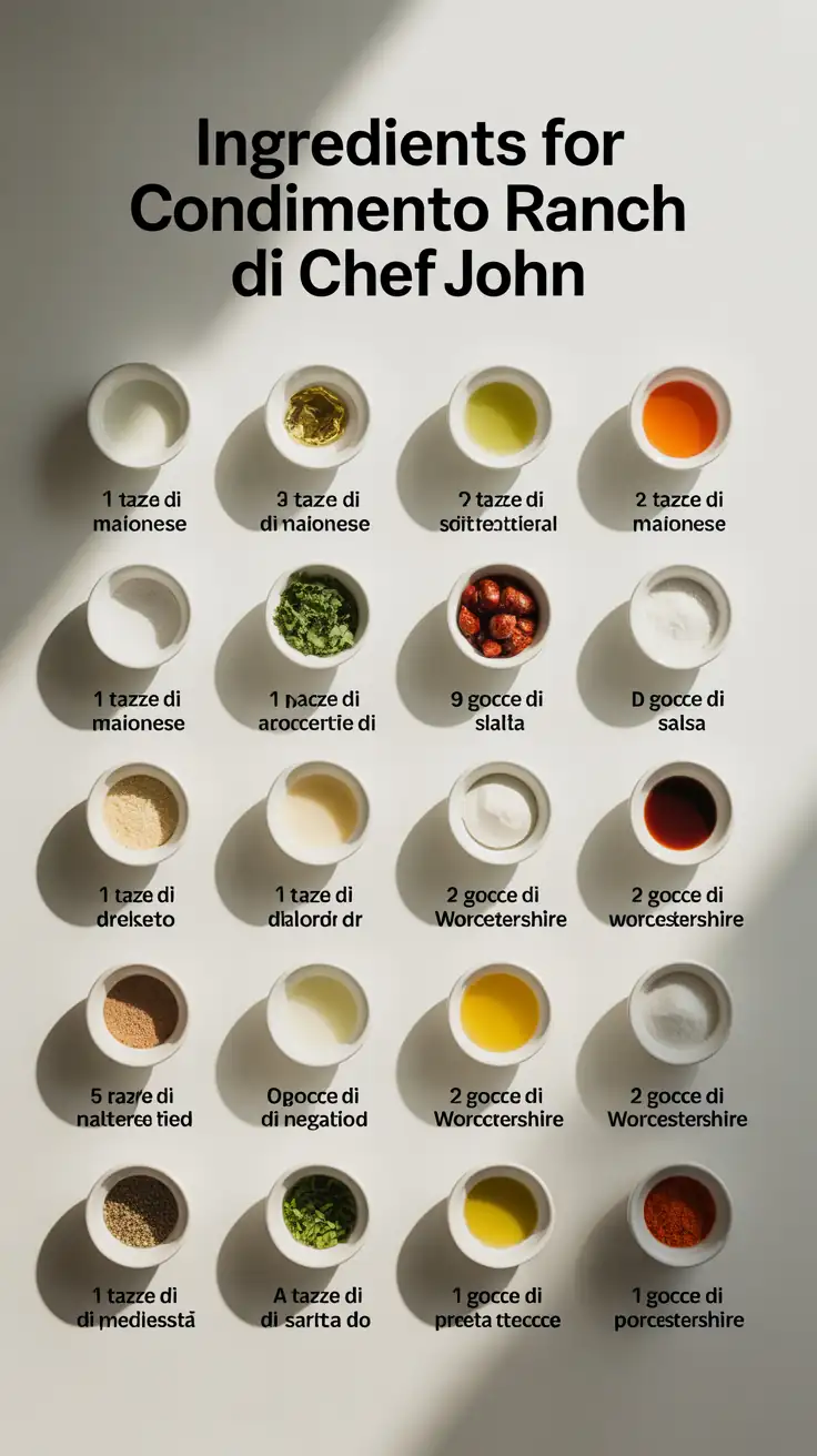 La scelta degli ingredienti giusti è fondamentale per esaltare il sapore di qualsiasi piatto, e il Condimento Ranch di Chef John non fa eccezione. Ecco una lista dettagliata degli ingredienti necessari e alcuni consigli per la selezione: