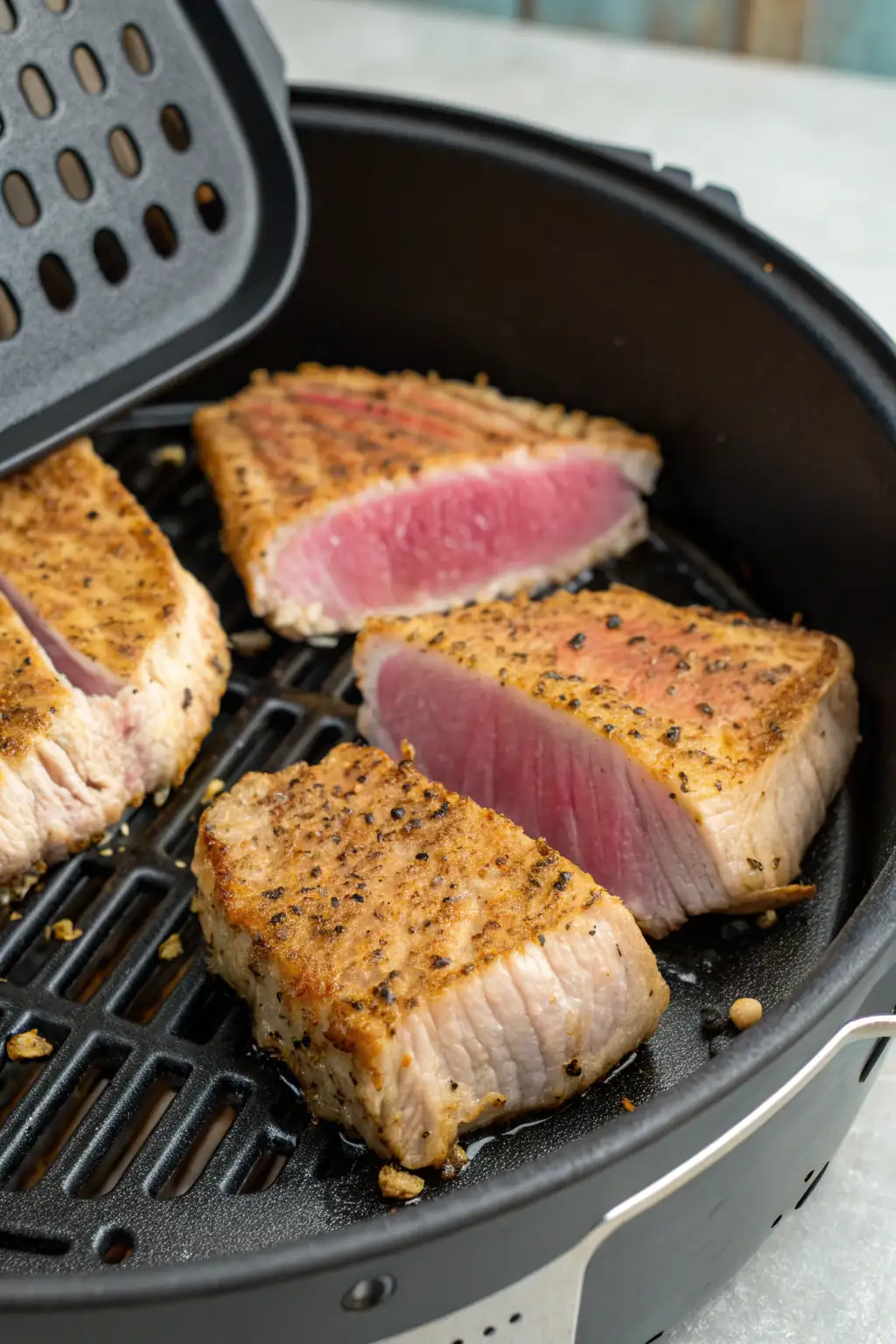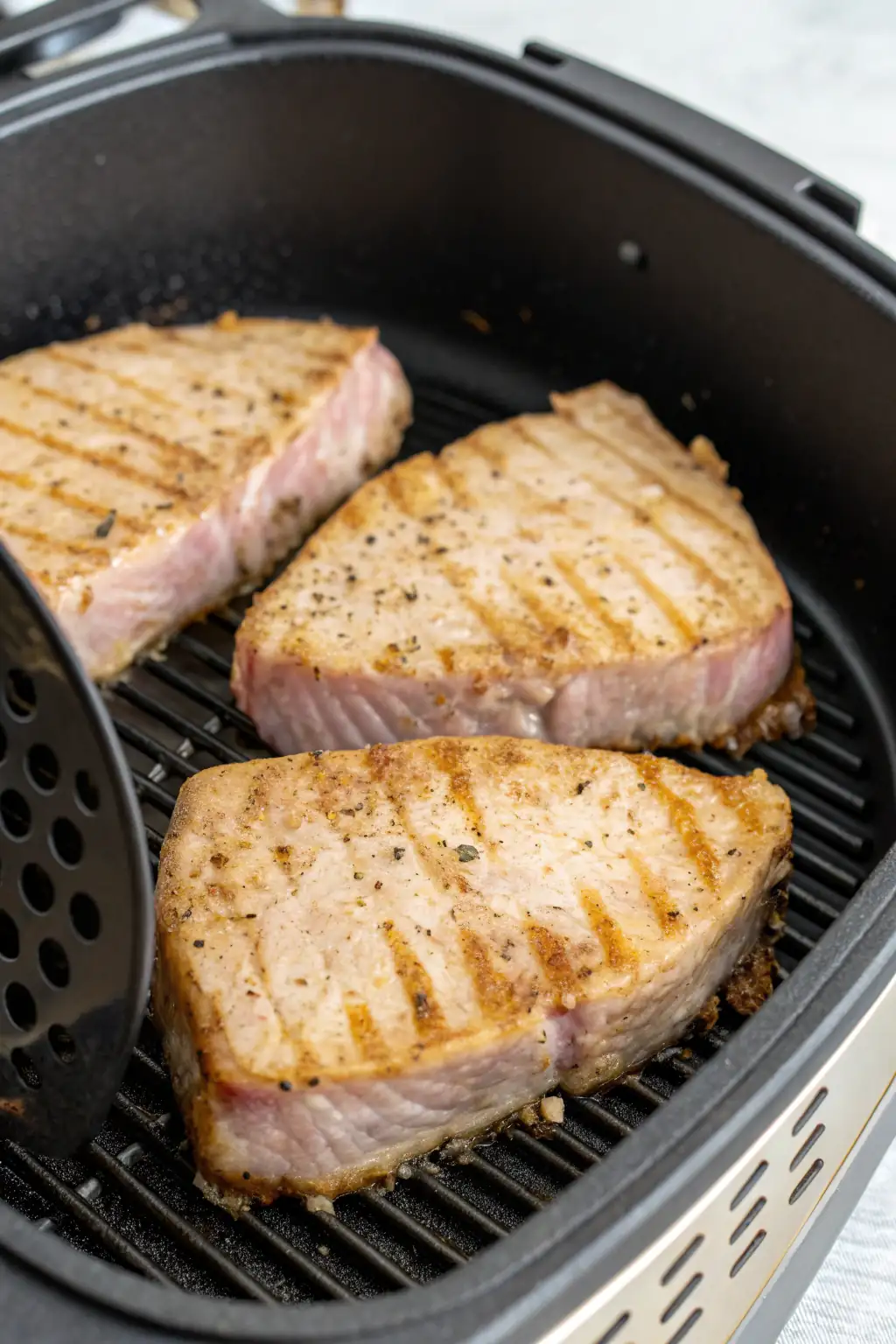 Rimuovi i filetti di tonno dalla friggitrice ad aria e lasciali riposare per un paio di minuti. Questo permette ai succhi di ridistribuirsi, mantenendo il pesce succoso. -