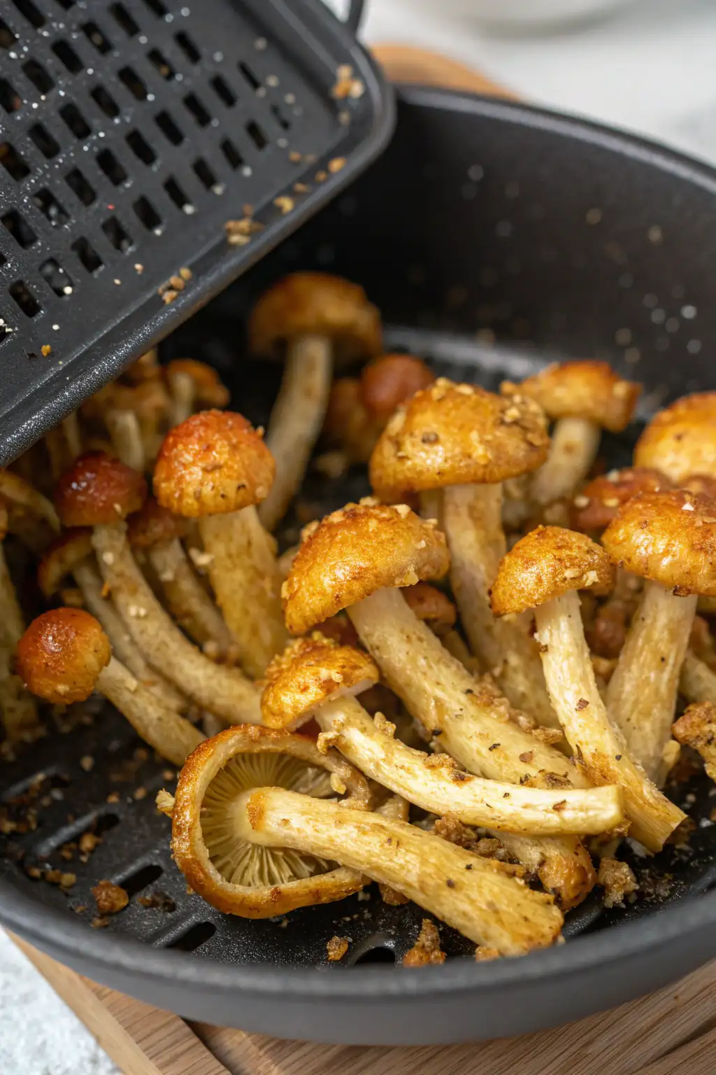 Rimozione dalla Friggitrice: Una volta dorati, rimuovete i funghi dalla friggitrice ad aria. Ammirate la loro splendida doratura e il profumo invitante.