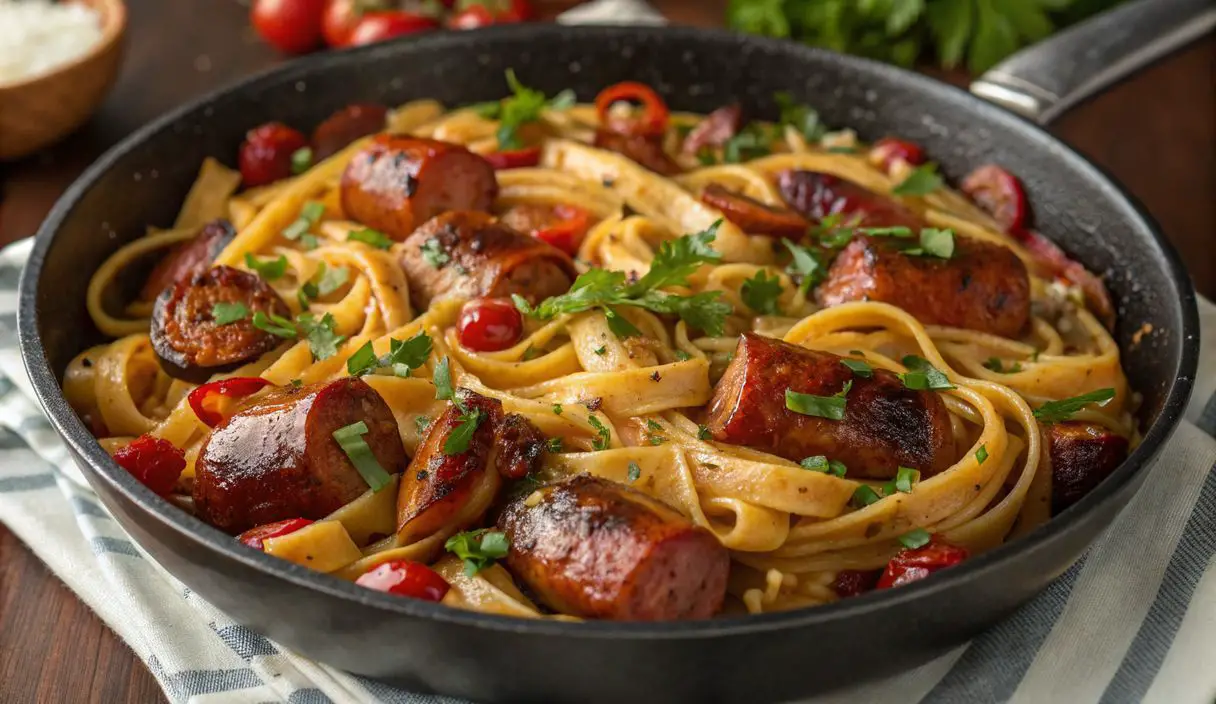 A flavorful and easy one-skillet pasta dish featuring turkey sausage, honey garlic sauce, and fresh parsley, ready in just 25 minutes.