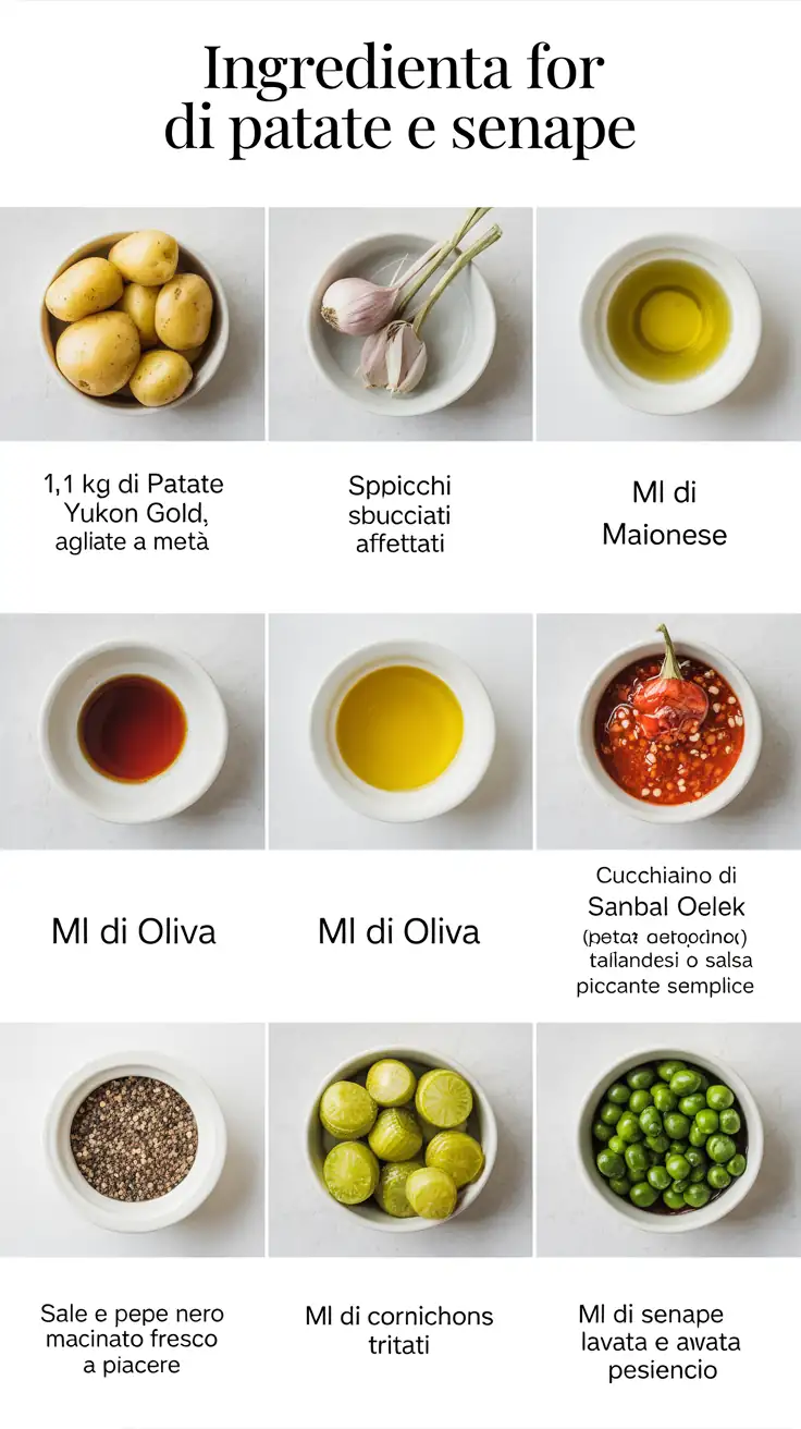 La qualità degli ingredienti è fondamentale per garantire il successo della nostra Insalata di Patate e Senape. Ecco la lista dettagliata e alcune note su ciascun ingrediente: