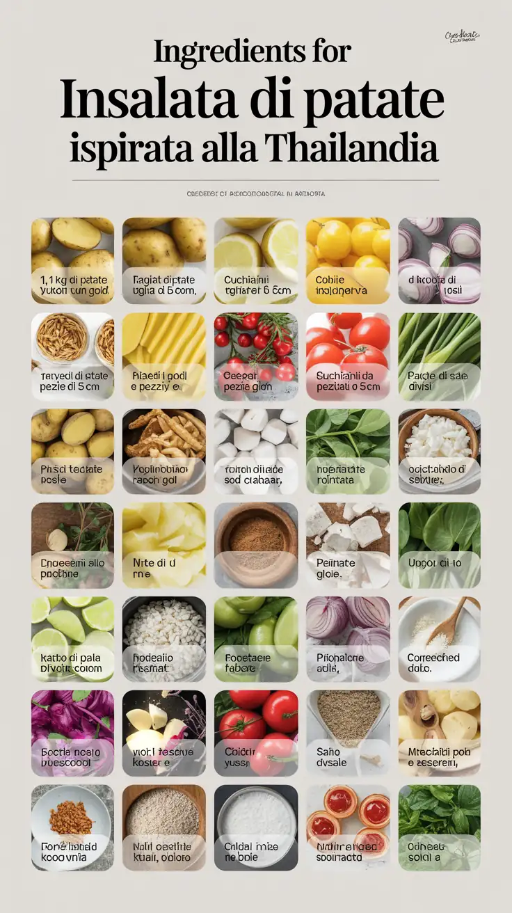 Per creare questa deliziosa Insalata di Patate Ispirata alla Thailandia, avrete bisogno di ingredienti freschi e di qualità, che vi aiuteranno a catturare l’essenza autentica di questo piatto.