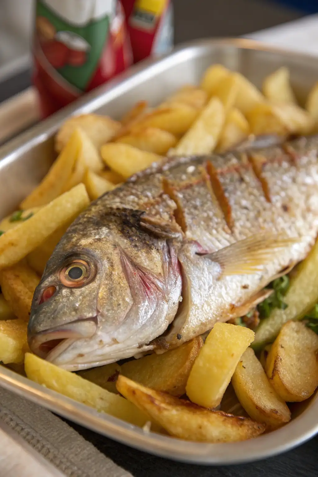 - Una volta pronto, controlla che il pesce sia cotto e che le patatine siano croccanti. Se necessario, aggiungi 2-3 minuti in più per la croccantezza desiderata.