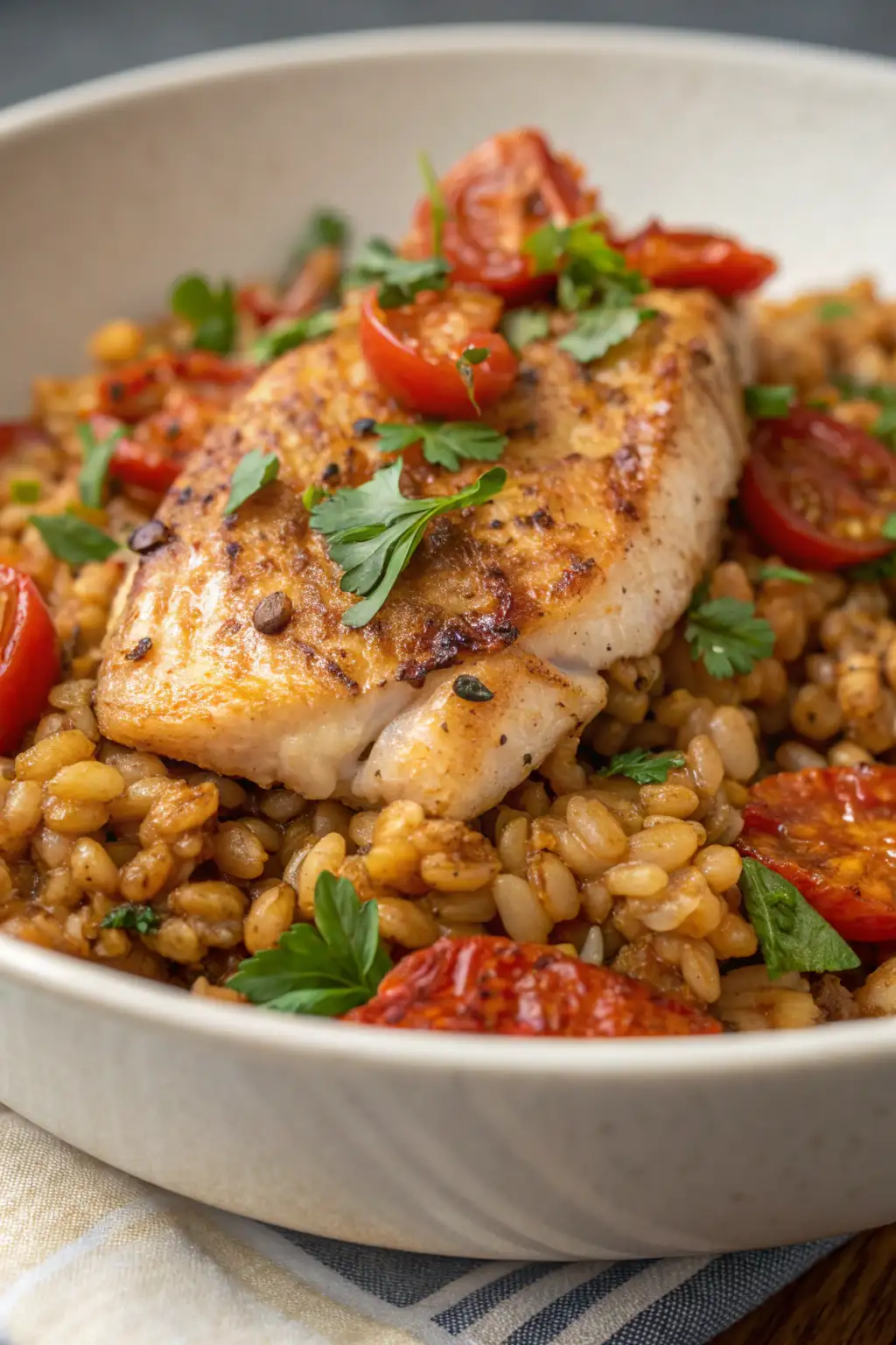 Pollo e Farro alla Mediterranea: Aggiungete olive, pomodorini secchi e capperi al piatto per un sapore mediterraneo completo.