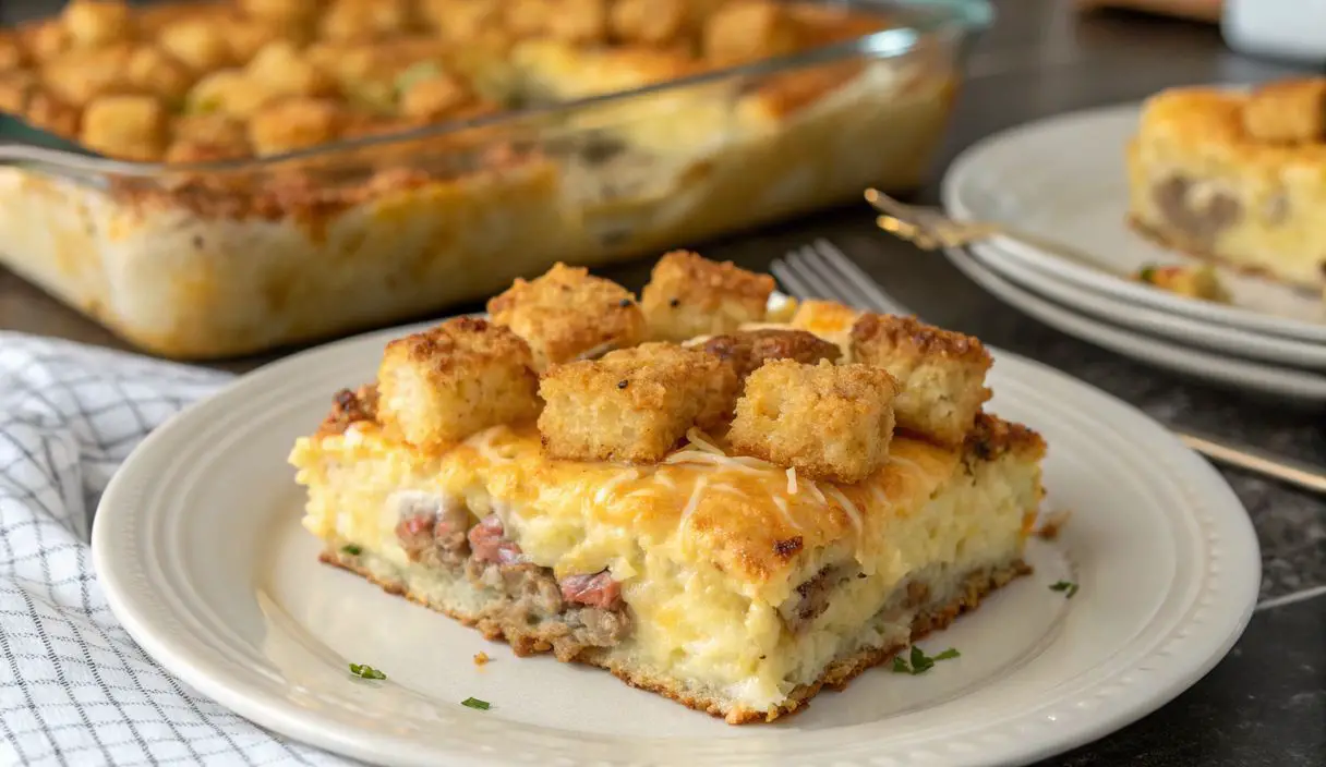 A comforting and delicious breakfast casserole with sausage, cream cheese, and tater tots, a modern twist on a familiar flavor.